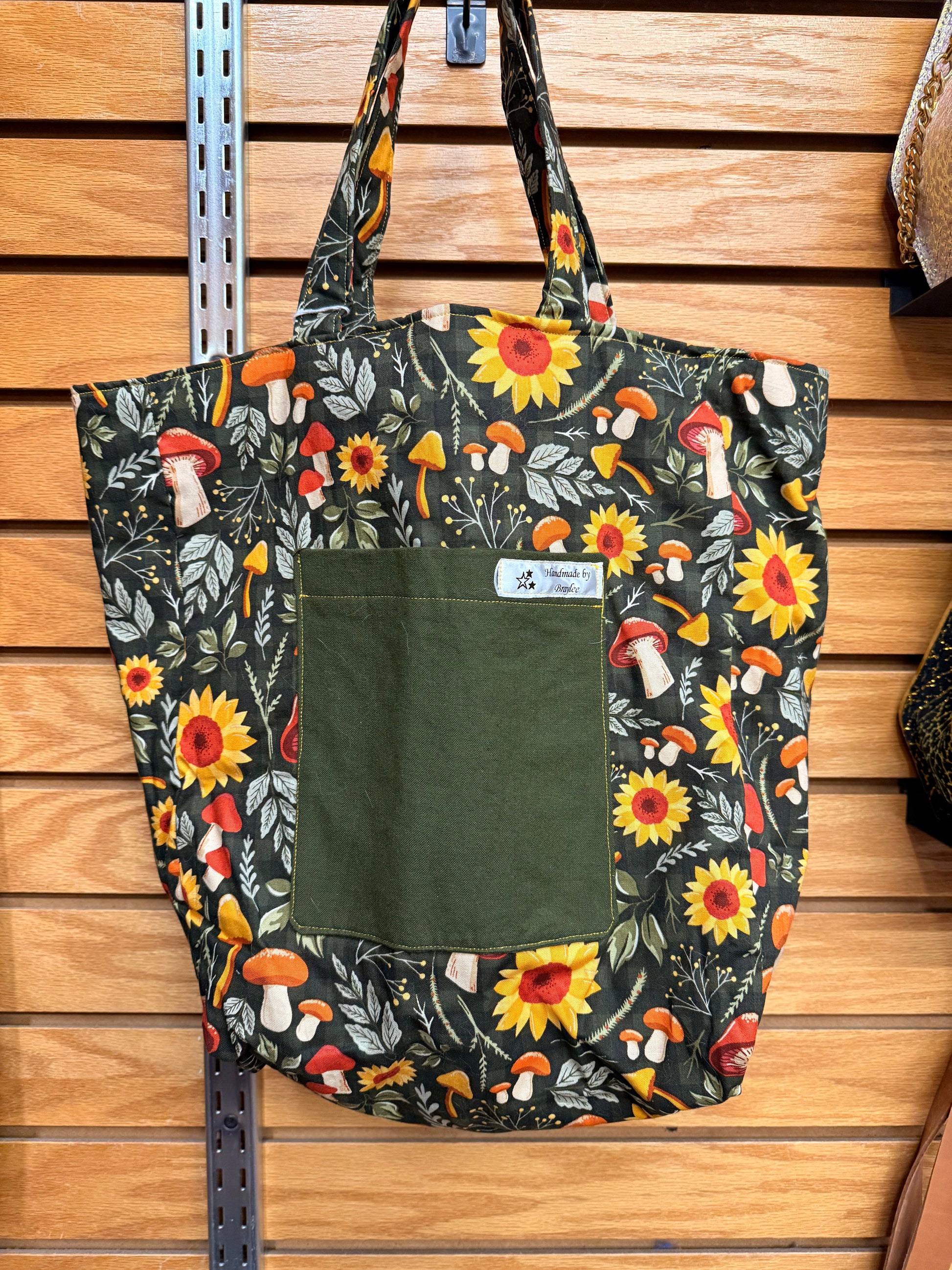 Each tote is unique and is about 14” tall by 14” wide. These soft totes are fully lined and interfaced for structure. The handles are sewn in and drops vary.